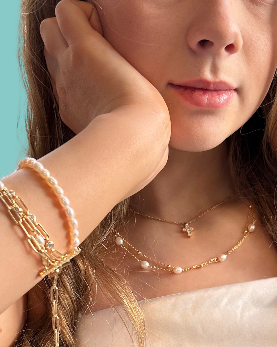 Perlur og fíngerðir skartgripir ramma inn fermingardaginn með fágun og mýkt – sem verða síðar hluti af hennar eigin stíl.
